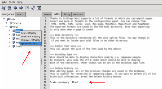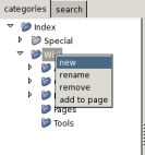 In Wixi, every ''folder'' in the tree is a category. Adding pages to a category can be done by right-clicking on a category. Select the "append to page" option. This will append a rule to the page with a category mark. You may add more then one category.